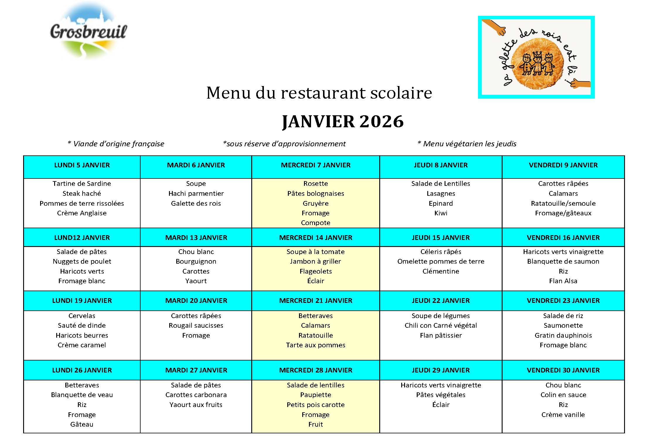 Site de la commune de Grosbreuil | Vie enfance-jeunesse | Restaurant scolaire | Menus | menu janvier